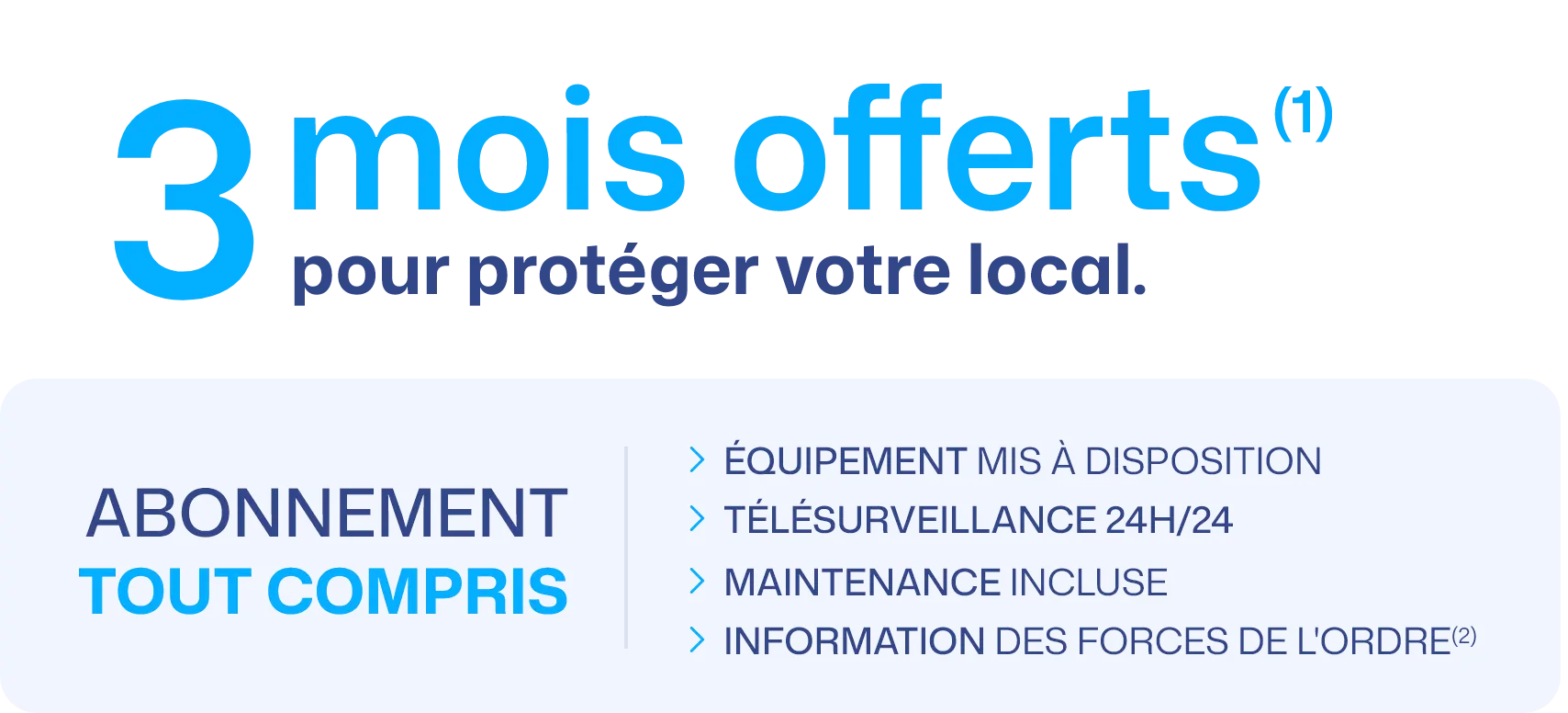 (1) Offre valable pour toute souscription du 3 au 29 novembre 2025, non cumulable avec toute offre ou promotion en cours. Valeur de la mensualité d’abonnement de télésurveillance offerte selon formule et options retenues le jour de l’installation, hors service La Vidéo et hors frais d’installation et de mise en service de 150 € HT. (2) Selon formule et après levée de doute conformément à la réglementation. Services proposés aux professionnels sous réserve des conditions et limites figurant dans les conditions générales. Engagement 12 mois minimum.